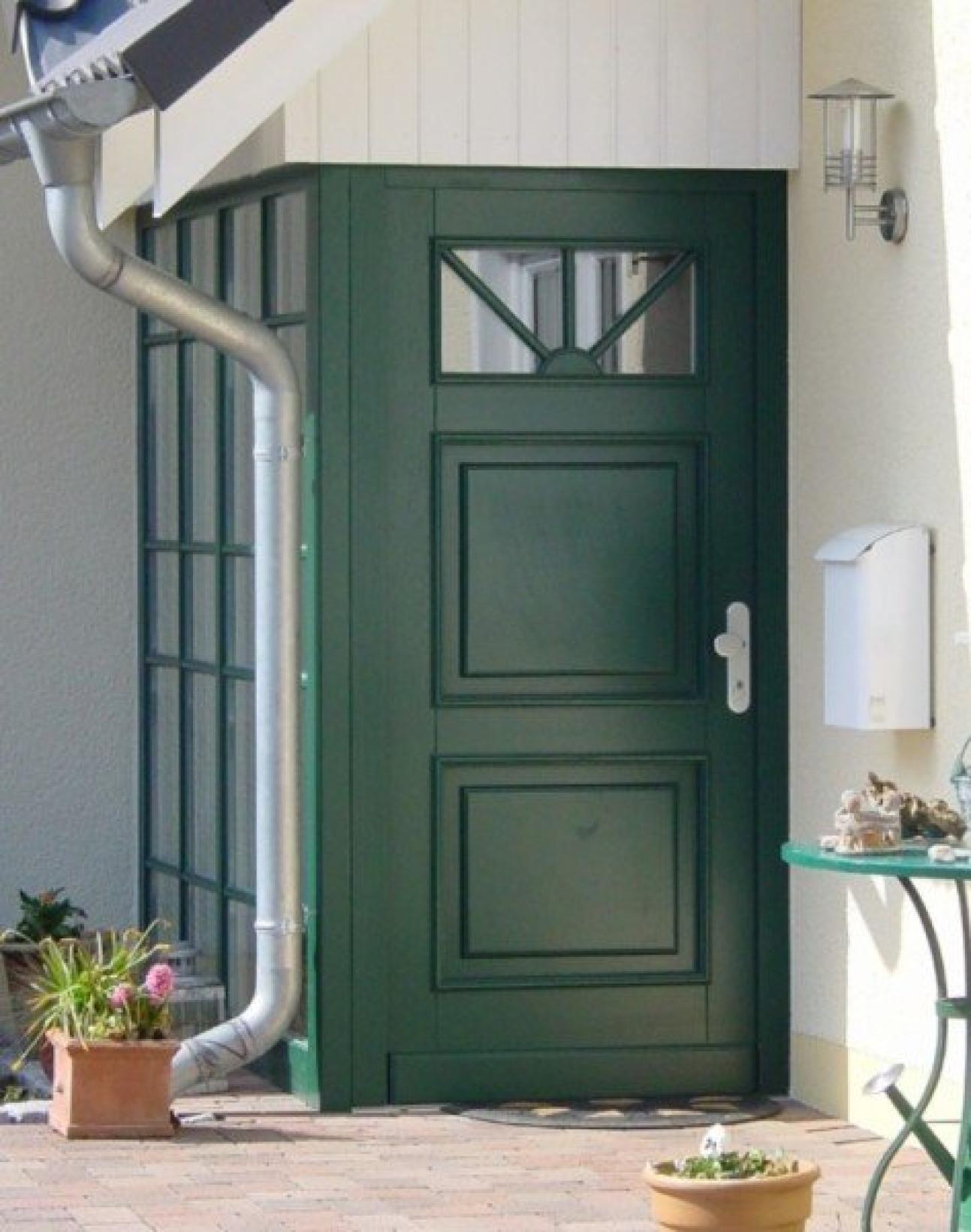 Holz-Haustüre Moosgrün mit rot abgesetzten Profilen in Kürten