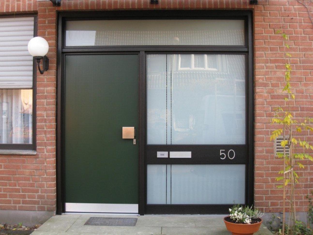 Holz-Haustüre Moosgrün mit rot abgesetzten Profilen in Kürten