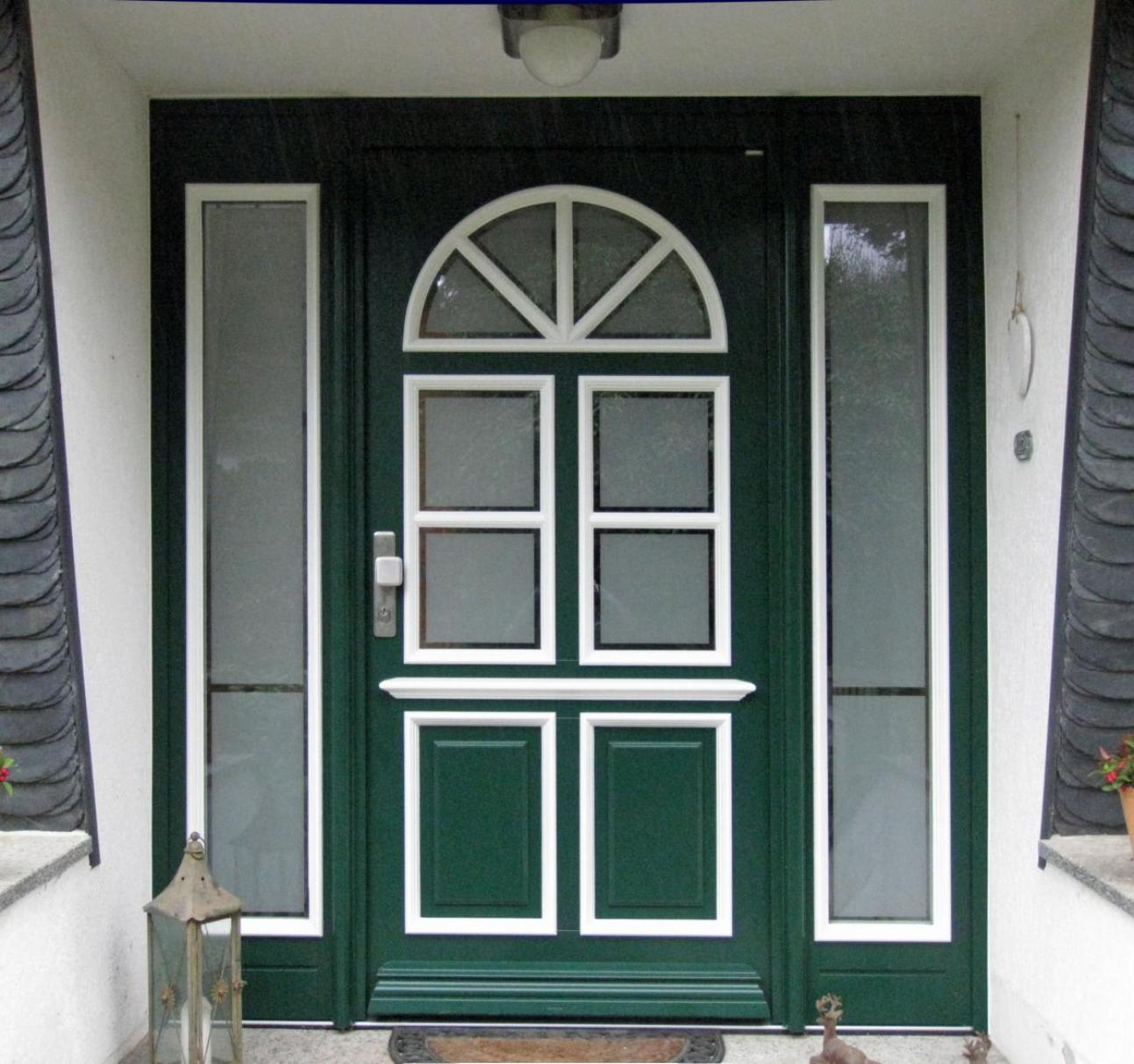 Holz-Haustür moosgrün mit weiß abgesetzten Profilen in Remscheid