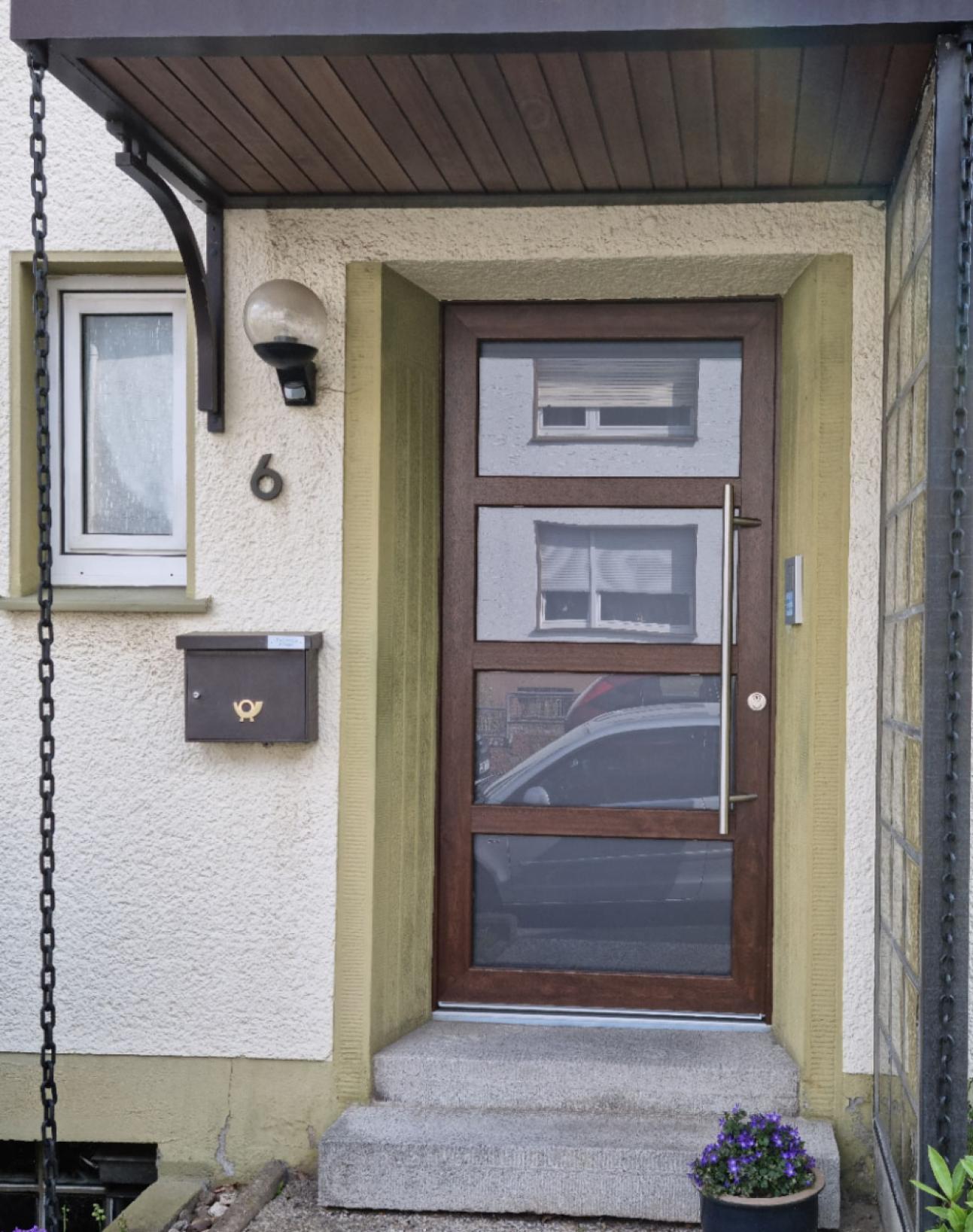 Holz-Haustüre Moosgrün mit rot abgesetzten Profilen in Kürten